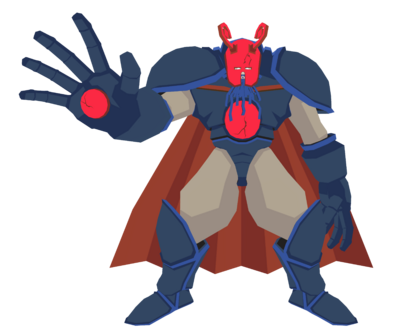 He shares the same design as Xenanu but with different colors, giving him a more "dead" appearance. His armor is darker, and his beard is a sickly green. His skin color is pale. Alex finds a giant figure of him in the Epilogue, which is described as a "PVC representation of your father in SNES form."
